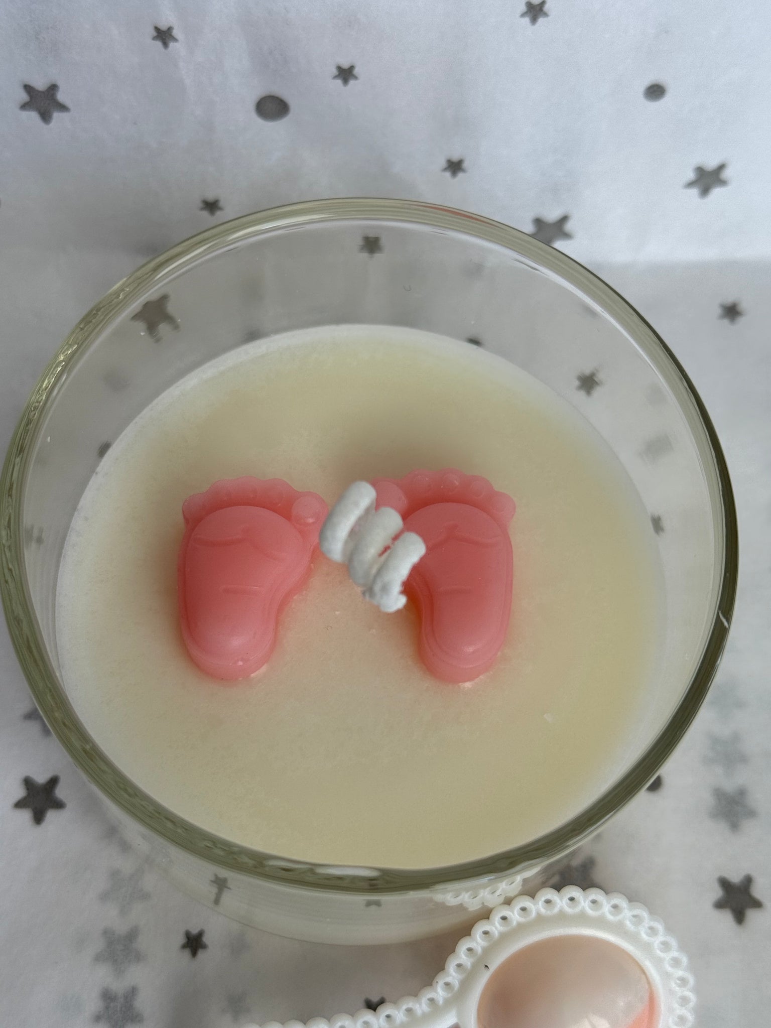 Introducing our Baby Reveal Candle - a 4oz 100% soy wax candle with a delicate baby powder scent. The adorable baby foot prints on the inside add a special touch to this already perfect baby reveal pink or blue . Perfect for gender reveals or for celebrating your little one's arrival.