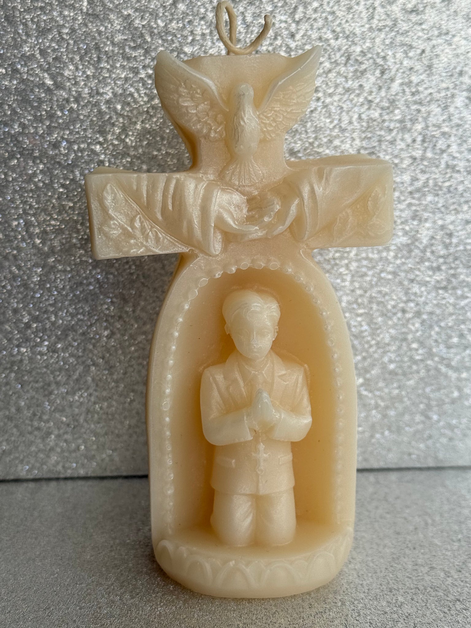 5” This 5” first communion pillar candle is hand-crafted with cempasúchil, making it a unique and beautiful addition to any first communion celebration. Made with care and attention to detail, this candle is a perfect way to commemorate this special occasion.