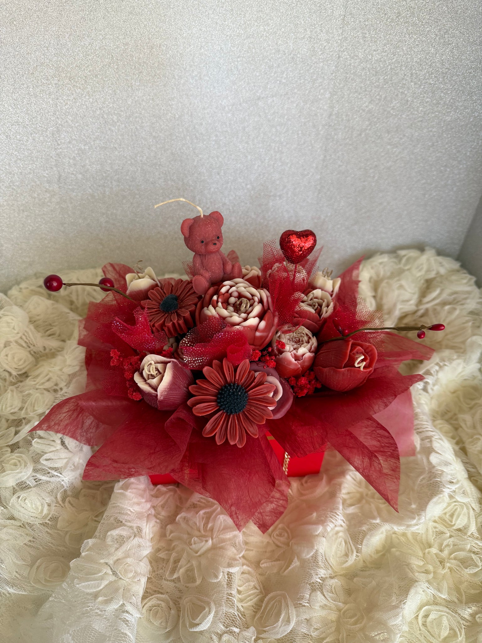 The Red Candle Bouquet features a unique arrangement of 20pcs red velvet-scented soy wax candles and wax melts. Measuring 10”x12”, this product combines aesthetic appeal with the calming properties of aromatherapy, enhancing any space with a warm ambiance and sophisticated fragrance.