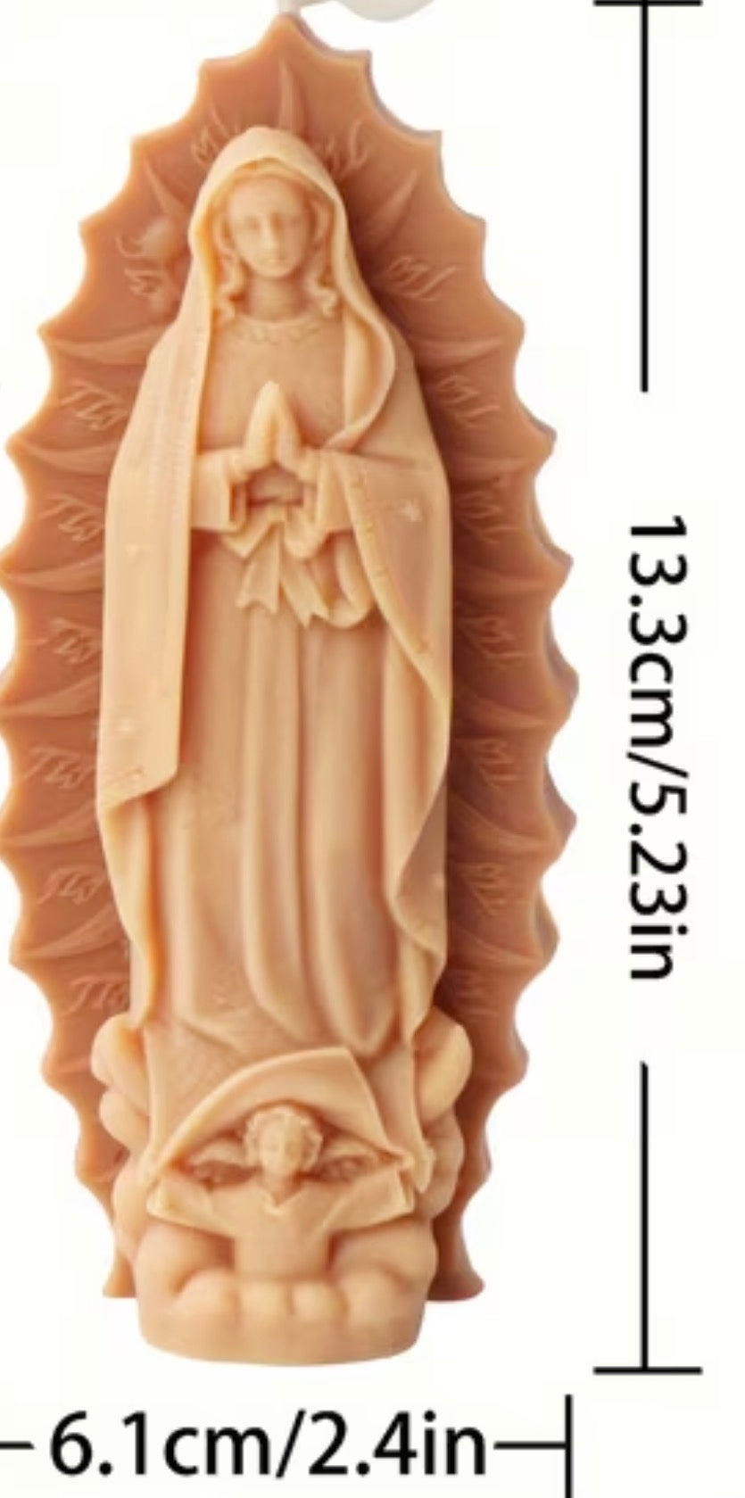 The Virgen de Guadalupe pillar candle stands 5.23 inches tall and is crafted from 100% soy wax, ensuring a cleaner burn. It offers a customizable color option and features a cempasúchil-scented floral fragrance, enhancing ambient conditions while providing a sustainable and eco-friendly choice for illumination.